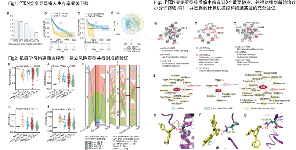 已建立在抑癌基因PTEN不同状态下胶质瘤病人的风险模型,得到显著独立预后的基因印记,并建立胶质瘤病人临床预后预测体系(专利申请号:202010977490.6)。针对PTEN突变型恶性胶质瘤预测得到的3个的靶标基因进行药物筛选,发现可与这三个蛋白同时结合的小分子化合物JQ1是潜在的治疗药物(Front Oncology, 2021)。本研究结合肿瘤前沿进展,并联合多种分析方法,对于胶质瘤的精准诊断、耐药机制研究、个体化治疗、临床分层和预后预测具有重要意义。