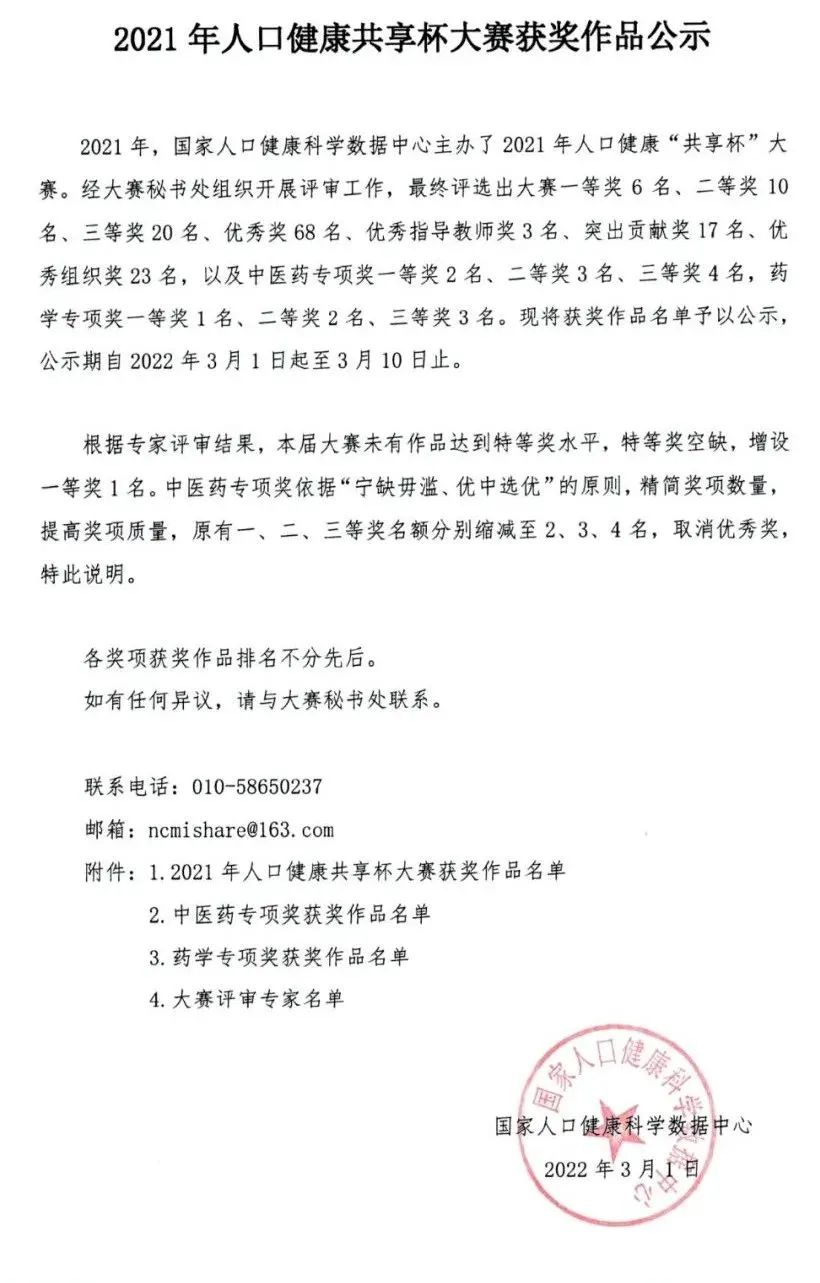 人口健康“共享杯”大学生科技资源共享服务创新大赛是由国家人口健康科学数据中心(原国家人口与健康科学数据共享服务平台)主办的全国范围内的大学生竞赛,旨在推进国家科技平台资源进校园、进院所,进一步深化科技资源开放共享工作,促进在校大学生、研究生充分利用国家科技平台资源开展科技活动,培养学生科技创新实践能力。