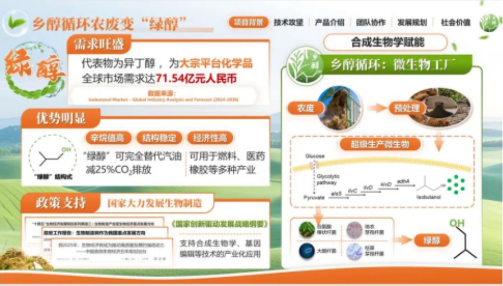 “乡醇循环”项目团队由betway西汉姆联王雨涵、侯真、东亮、毋彤等研究生组成,指导教师为霍毅欣、陈振娅、孙丽超、邹沁、马晓焉。“乡醇循环-微生物定向转化,农作物变绿醇”以社会实践出发,发现随着农业生产不断积累的农业废弃物,如何有效利用这些资源,减少环境负担,同时为农民创造额外收入,成为了现代农业面临的重大挑战。乡醇循环团队通过先进的合成生物学技术,将这些堆积的农作物和农业废物转化为高价值的绿醇,从而实现农业废弃物的资源化和能源化,开创了城乡资源双向流动的新局面。