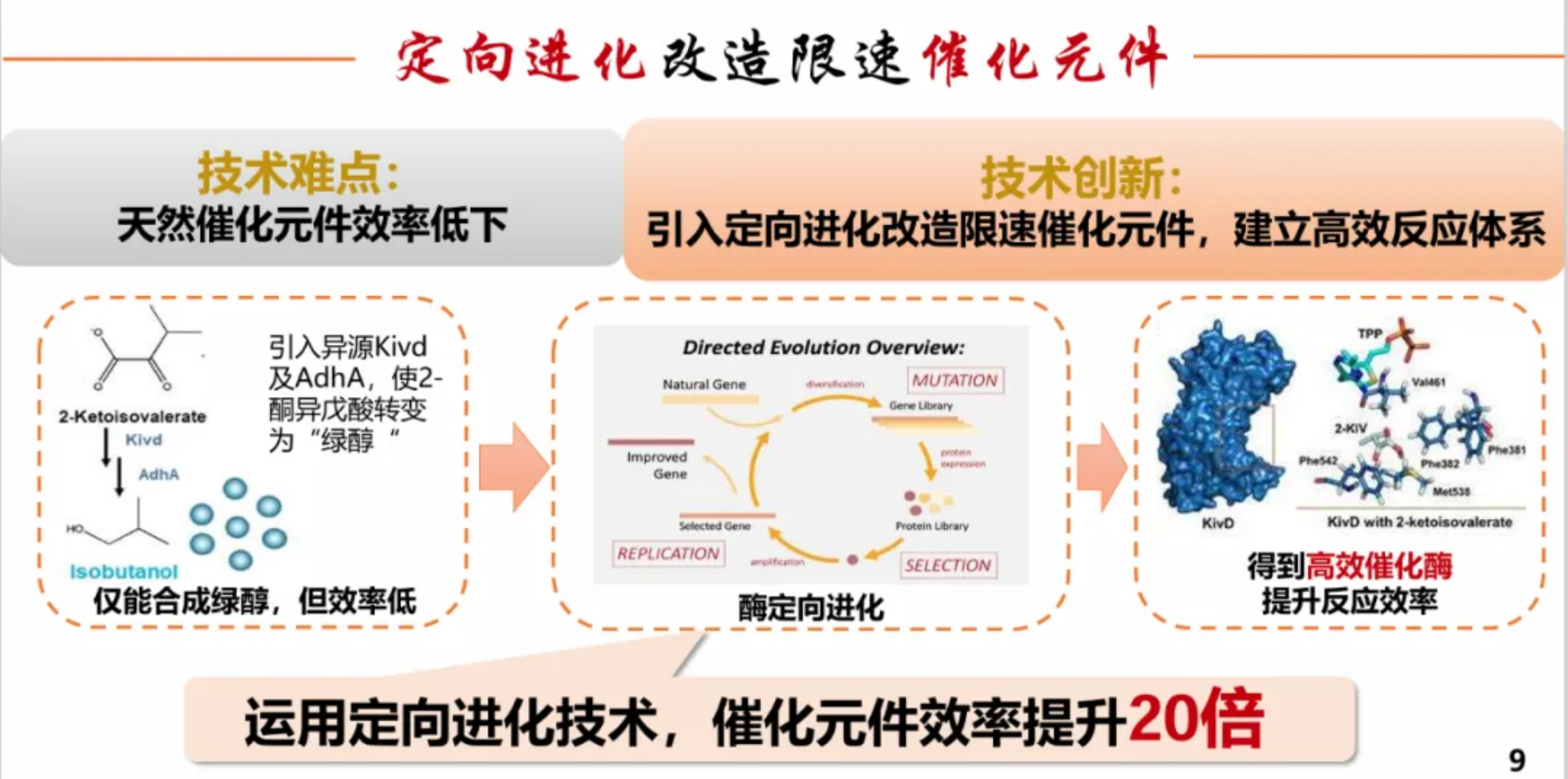 二、针对原有天然催化元件效率低下的问题,我们运用定向进化技术,改造限速催化元件,使催化效率显著提升。
