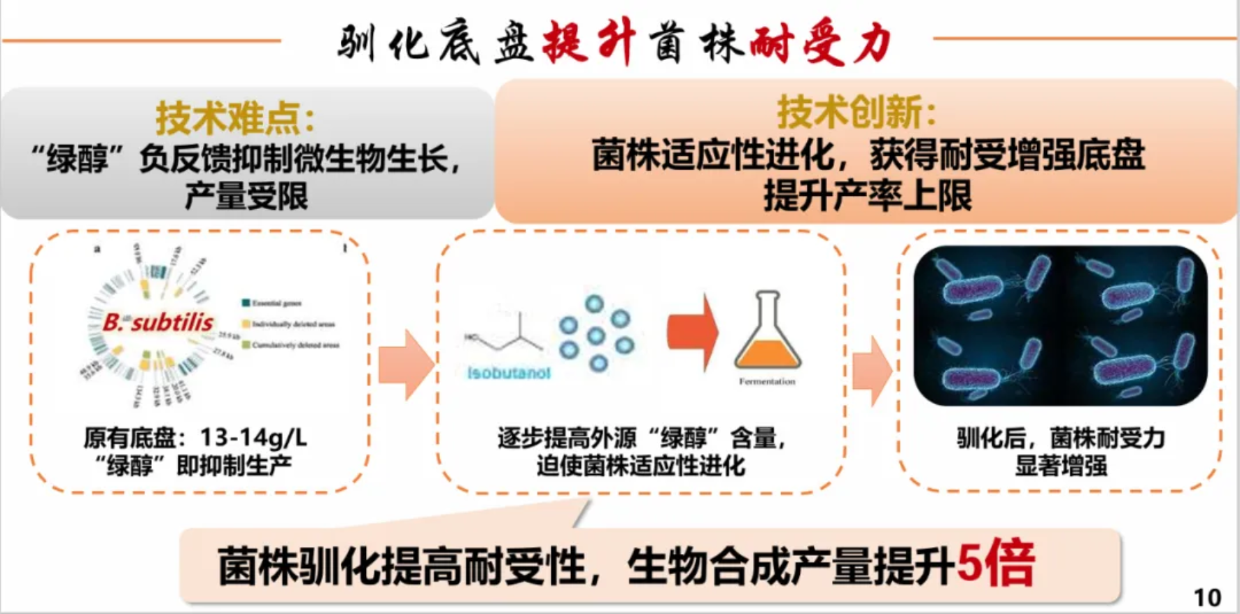 三、当反应体系中的绿醇达到13-14g/L时,微生物生长受到抑制,我们针对这一抗逆性问题,对菌株进行“适者生存”的适应性进化,使其耐受绿醇的能力显著增强,产量突破5倍达到百克以上。