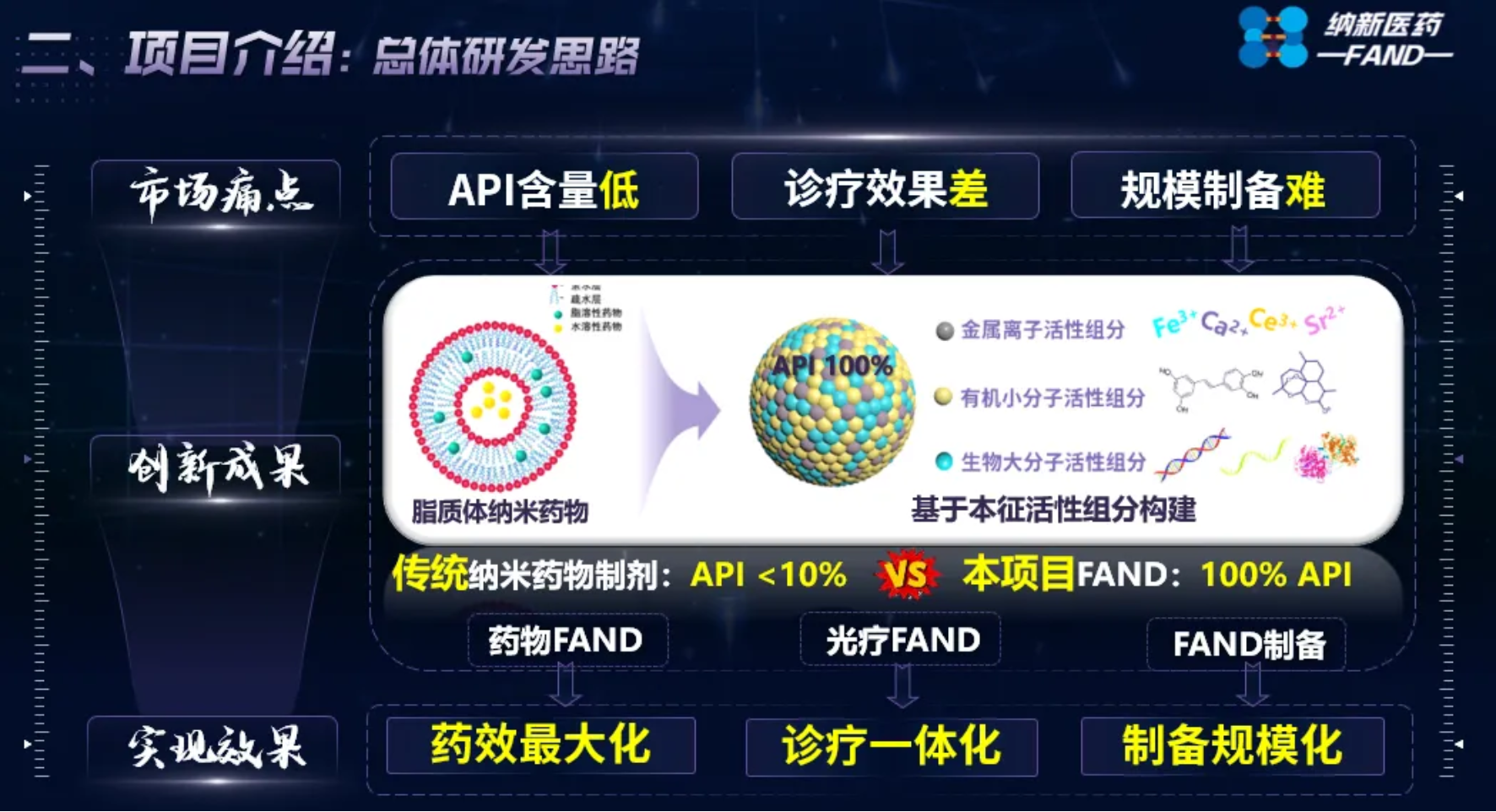 医药原始创新是国家的重大战略需求,也是发展新质生产力的关键。与传统药物递送系统相比,纳米给药系统不仅能够实现器官靶向、高效低毒等突破,还可以实现药物的低成本及大规模生产。新冠mRNA纳米疫苗的应用进一步证明纳米药物的广阔应用前景及社会经济效益。然而,传统载体型纳米药物仍面临转化率低的瓶颈,其研发痛点包括:API(活性药物成分)含量低、诊疗效果差、规模制备难等。基于此,本团队首次提出药物研发新理念——全活性纳米药物(Full-API Nanodrug,FAND),实现3大技术突破——药效最大化、诊疗一体化、制备规模化;以期最终实现新药研发全路线推进和全类型覆盖。