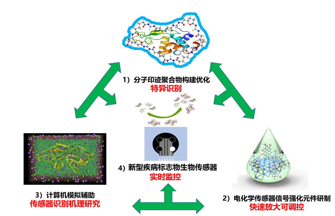 本实验室致力于面向疾病标志物快速检测的新型生物传感技术研究,通过综合应用新型增敏纳米材料制备技术、电化学传感技术、表面印迹技术、丝网印刷技术、电位调控技术以及各种化学反应来形成高效先进的分子印迹生物传感器,以实现对多种重要疾病标志物的快速检测。