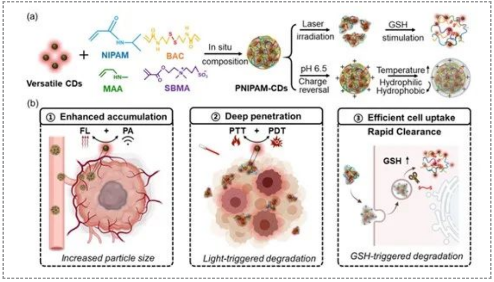 博士生赵晨报道了一种具有程序化刺激响应性的碳点-纳米凝胶复合物(PNIPAM-CDs)。PNIPAM-CDs具有以下特点:(1)开发了碳点的深红色荧光、光声成像能力、光热和光动力治疗功能;(2)与单独的碳点相比,碳点与纳米凝胶的复合物由于粒径增大,生物相容性提高,血液循环时间更长,更有利于材料在肿瘤部位的累积;(3)PNIPAM-CDs可以通过单波长的激光照射触发光热和光动力治疗效果,不仅可以诱导癌细胞凋亡,而且可以减小复合物的粒径,促进功能成分在肿瘤部位的深度渗透;(4)通过PNIPAM-CDs的pH响应电荷翻转和温度依赖性亲水/疏水转换能力增强材料被细胞的摄取;(5)由于谷胱甘肽(GSH)的过表达,部分降解的PNIPAM-CDs进入肿瘤细胞后会发生进一步的裂解,这有利于它们从体内快速清除。这些特性使PNIPAM-CDs成为优异的程序化荧光/光声成像引导的光热/光动力协同肿瘤治疗纳米平台。