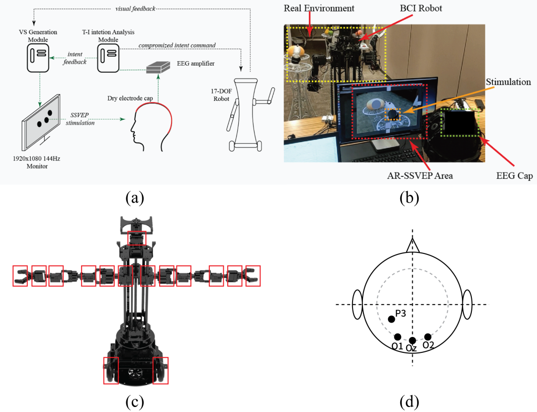 Methods: Objects in scene was firstly recognized and tracked by machine vision. AR-VS was generated based on neural network recognition and light stream tracking. The number and distribution of visual stimulation was confirmed by recognized objects. Electroencephalogram (EEG) features corresponding to VS and human intent was collected by dry-electrode EEG cap, and figured out by filter bank canonical correlation analysis(fb-CCA) method. Key parameters in the AR-VS, including the effect of VS size, frequency, dynamic object moving speed, ITR and the performance of BMI controlled robot was analyzed, respectively.