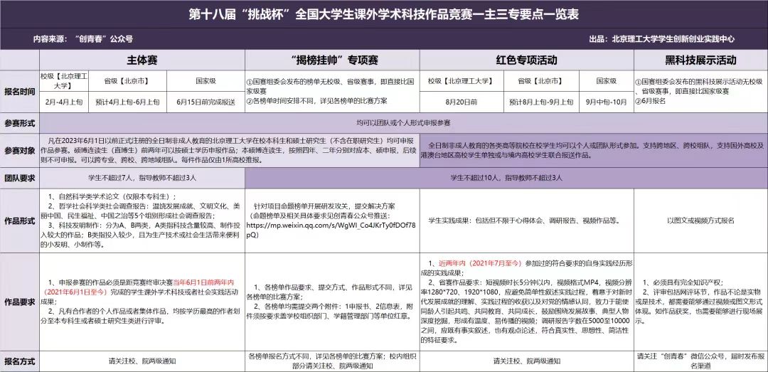 形成一览表(各项目时间见附件:【北理双创】18届大挑揭榜挂帅专项赛分享包),便于大家查阅。