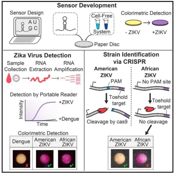 病毒疫情的爆发表明我们需要开发低成本、检测快速、灵敏的诊断方法,以便在大流行地区分发和使用。本文报道了一种快速设计,组装, 以及无细胞体系的、基于试纸的传感器来用于检测寨卡病毒。通过将等温RNA扩增与核酸开关联系起来开发出一种RNA传感器,可以特异性检测寨卡病毒序列。该传感器进一步与CRISPR/Cas9结合,可以区分单碱基不同的病毒株。该文章证明了合成生物学可应用于分子检测与诊断以应对全球卫生危机。