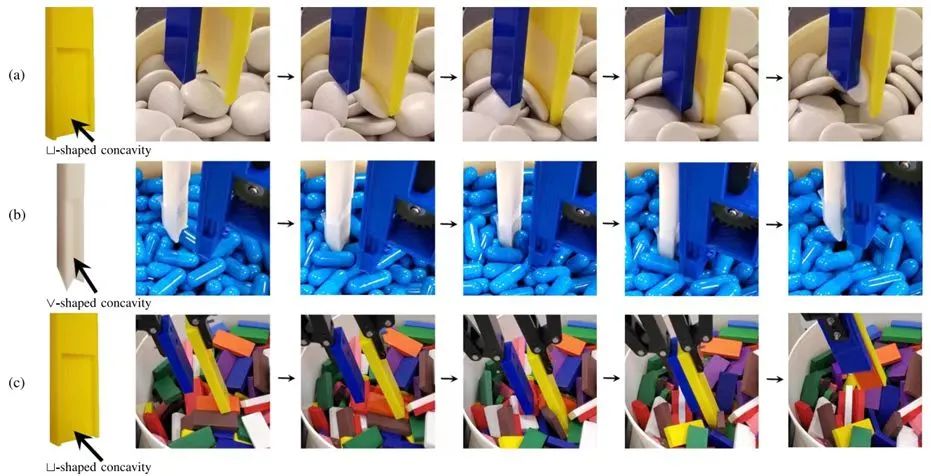 本文介绍了一种从混乱环境中同时进行分离和拾取目标的新方法。该方法可以实现机器人在混乱环境中有效地拾取,这在许多工业应用中具有重要意义,但仍然难以实现,尤其是对于轮廓较薄的物体。我们利用平面准静态推送操作作为机器人和要拾取的对象之间标准化物理交互的一种方式。提出了一种具有手指不对称设计的夹持器,它是一种具有不同手指长度的双指夹持器,是通过可控的推送动作成功分离和拾取的关键。本文将详细介绍操作过程和设计原则。大量实验验证了我们的方法在三维空间拾取任务中的有效性。除了拣选,还展示了更复杂的操作能力,如自动拣选和放置/包装。