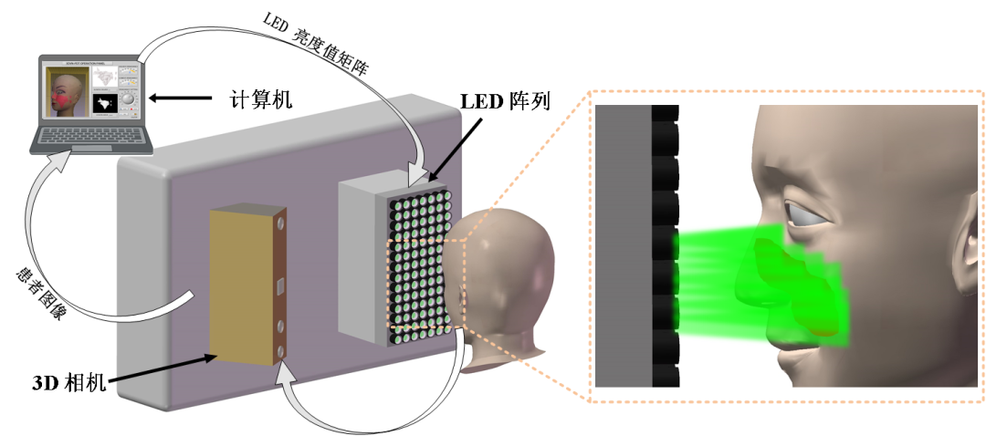 光动力疗法(Photodynamic Therapy, PDT)是临床治疗皮肤疾病的一种新型疗法,它利用光敏剂、光和氧分子三种要素的共同作用杀死靶细胞。光在其中扮演了相当重要的角色,适当的辐照度能够达到良好的治疗效果,反之若辐照度过高则易造成灼伤,若辐照度过低则达不到治疗效果。由于皮肤病灶多处于复杂的三维曲面,传统光源无法在病灶区域形成符合预期要求的均匀辐照度;为避免局部辐照度过高而造成灼伤,医生常采用较低的辐照度进行治疗,但同时也降低了治疗效率。