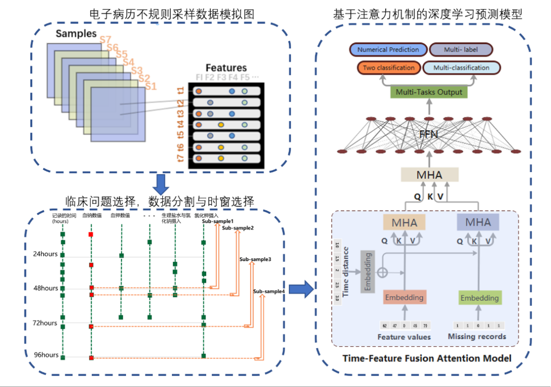 血钠异常是重症监护病房(intensive care unit,ICU)最常见的电解质失衡,也是急性重症脑卒中的常见并发症之一,与更高的死亡率和更长的ICU滞留时间相关,在脑卒中发生颅内压(intracranial pressure,ICP)增高的治疗过程中,血钠水平及其波动直接影响预后。但是目前在血钠管理中仍是医生通过经验进行人工评估,主观性较大,不同医生判断的一致性较差。在ICU中产生了海量的不规则采样的、稀疏的临床EHR数据,这对传统的机器学习建模是个挑战,因为对于传统预测建模技术来说,每个要预测的结果都需要创建一组相同时间结构的特定变量的数据集。一般的神经网络方法被设计成在连续的时间序列之间处理具有恒定时间间隔的数据,从而导致不规则时间间隔的次优性能。我们的研究旨在建立一个能处理不规则采样的、稀疏的血钠数值与干预措施的预测模型,这将为我们从EHR缺失数据和时间间隔中获取更多关于疾病的信息。