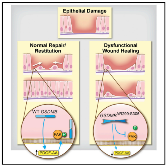 Gasdermins是由六种蛋白质成员组成的蛋白质家族,在先前的研究中发现其主要在细胞焦亡发挥作用。Gasdermin B (GSDMB)由于本身结构独特并且在小鼠中缺乏同源物而被研究较少,但在最近的研究中发现其与慢性肠粘膜炎症疾病的易感性相关。炎症性肠病(IBD)是导致肠屏障功能损害的疾病,在目前一直没有很好的治愈方法,主要以缓解疾病的症状为主。在本研究中,作者发现在炎症性肠病患者的肠粘膜样本中,GSDMB的含量增加,尤其是在肠道上皮细胞。通过单细胞分析确定炎症结肠细胞/隐顶结肠细胞的上皮特异性。GSDMB在体外伤口愈合过程中增殖和迁移增加,而GSDMB缺陷的细胞中被抑制,并显示出高粘附性。而且携带疾病相关的GSDMB的SNPs会造成功能缺陷,破坏上皮细胞的恢复/修复。研究人员通过对机制的探究发现,GSDMB的缺失主要破坏了PDGF-A介导的FAK的磷酸化。通过本研究表明,这使得GSDMB可能成为上皮屏障功能恢复和炎症解决的关键因素。