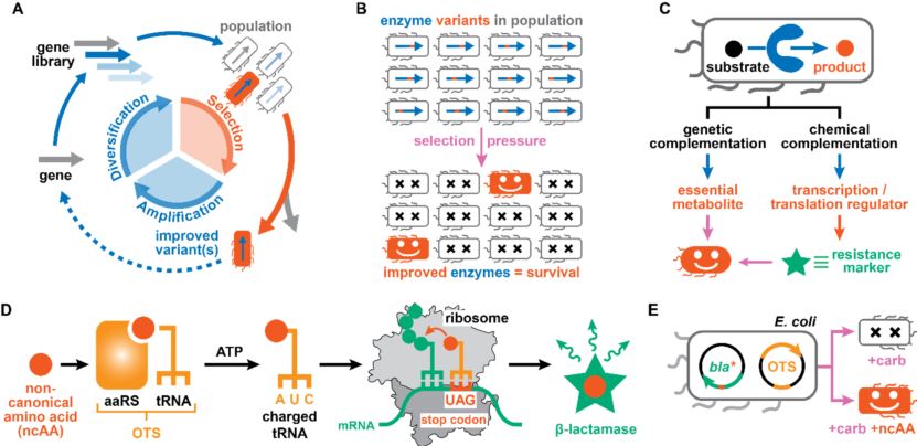 定向进化策略可以在实验室中模仿达尔文进化,获得活性更高,稳定性很好,反应范围更宽的酶突变体,已经成为酶改造和筛选的有力工具然而,体内筛选过程通常需要将酶活性与细胞的存活联系起来,这使得对不履行代谢功能的酶的筛选较为困难。这篇文章提出了一种体内选择策略,利用密码子拓展技术,在目标酶的催化产物与报告基因的顺利翻译通读之间搭建了桥梁。通过使用一种特异性依赖目标酶的产物的tRNA/aaRS正交对,向目标UAG位点定点插入酶的产物(非标准氨基酸)而通读报告基因β-内酰胺酶,携带优异酶突变体的菌株能够在更高浓度的氨苄霉素抗生素中存活。以氨甲酰酶为例,最终筛选到的氨甲酰酶突变体的催化效率比野生酶高出5个数量级。这种策略不需要较多的人为干预,不依赖专门的设备,有可能成为多种生物催化剂在体内定向进化的多功能工具。
