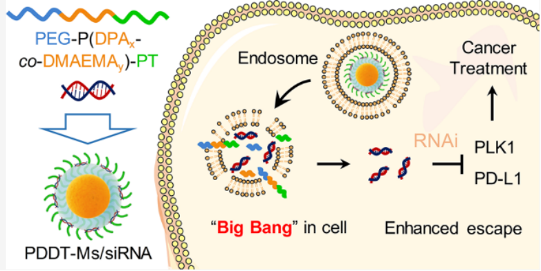 小干扰核酸(siRNA)药物近年来连续获批上市,已成为继小分子和抗体之后,引领第三次制药浪潮的代表性技术之一。siRNA药物在细胞质中发挥作用,但其自身难以进入细胞。除了研究荷载siRNA高效富集到靶组织、促发胞吞的递送载体外(“进得去”),如何显著提高已被胞吞的siRNA从内涵体逃逸到细胞质的效率(“出得来”)是开发siRNA药物的关键科学问题和重要研究方向。前期已有研究表明,内吞入胞的siRNA只有1-2% (甚至低于1%) 能从内涵体中逃逸到细胞质,高效的内涵体逃逸是siRNA药物开发中最重要但也最具挑战性的问题。在此,我们设计合成了一种新型pH响应性的三嵌段聚合物mPEG45-P(DPA50 -co-DMAEMA56)-PT53(PDDT)。