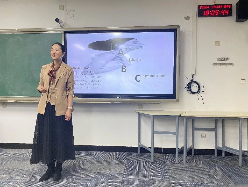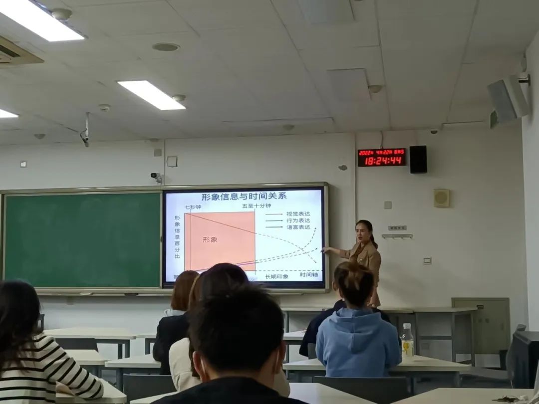 最后,田静老师为同学们总结了职场妆容和着装规则。不论是职场男女妆容的区别,还是职场应佩戴的首饰类型,甚至是女生在不同场合如何选择口红色号,田老师都一一做了细致入微的讲解。这令在场的女同学们大开眼界,男生们也纷纷表示获益匪浅。