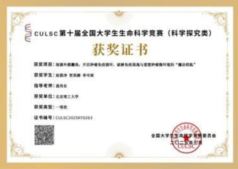项目“细菌外膜囊泡:开启肿瘤免疫循环,破解免疫逃逸与重塑肿瘤微环境的‘魔法钥匙’”,一等奖。