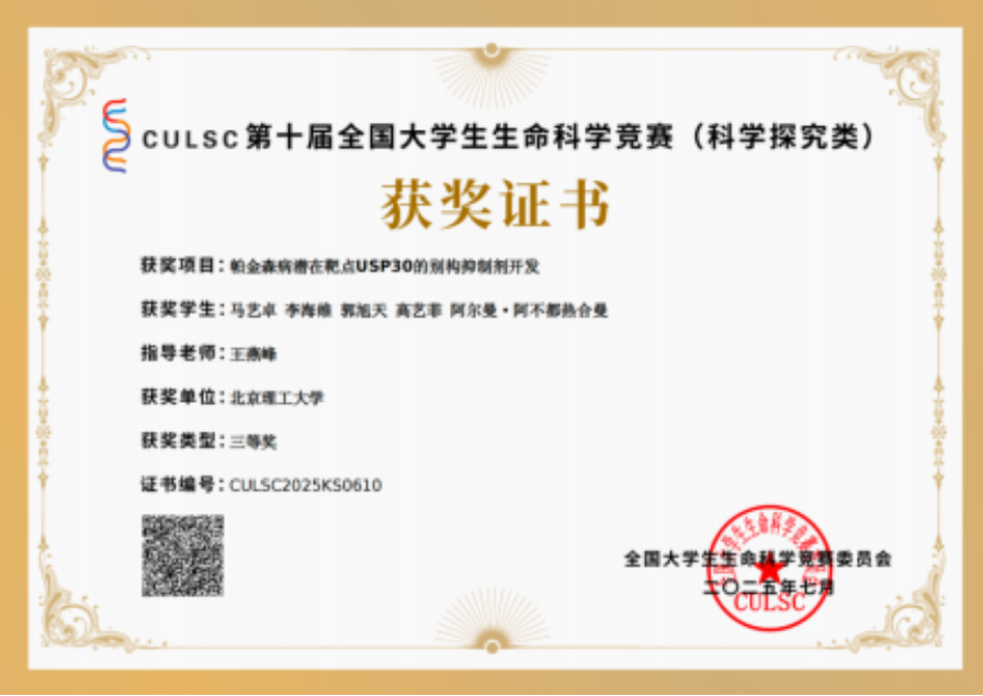 项目“帕金森病潜在靶点USP30的别构抑制剂开发”,三等奖。
