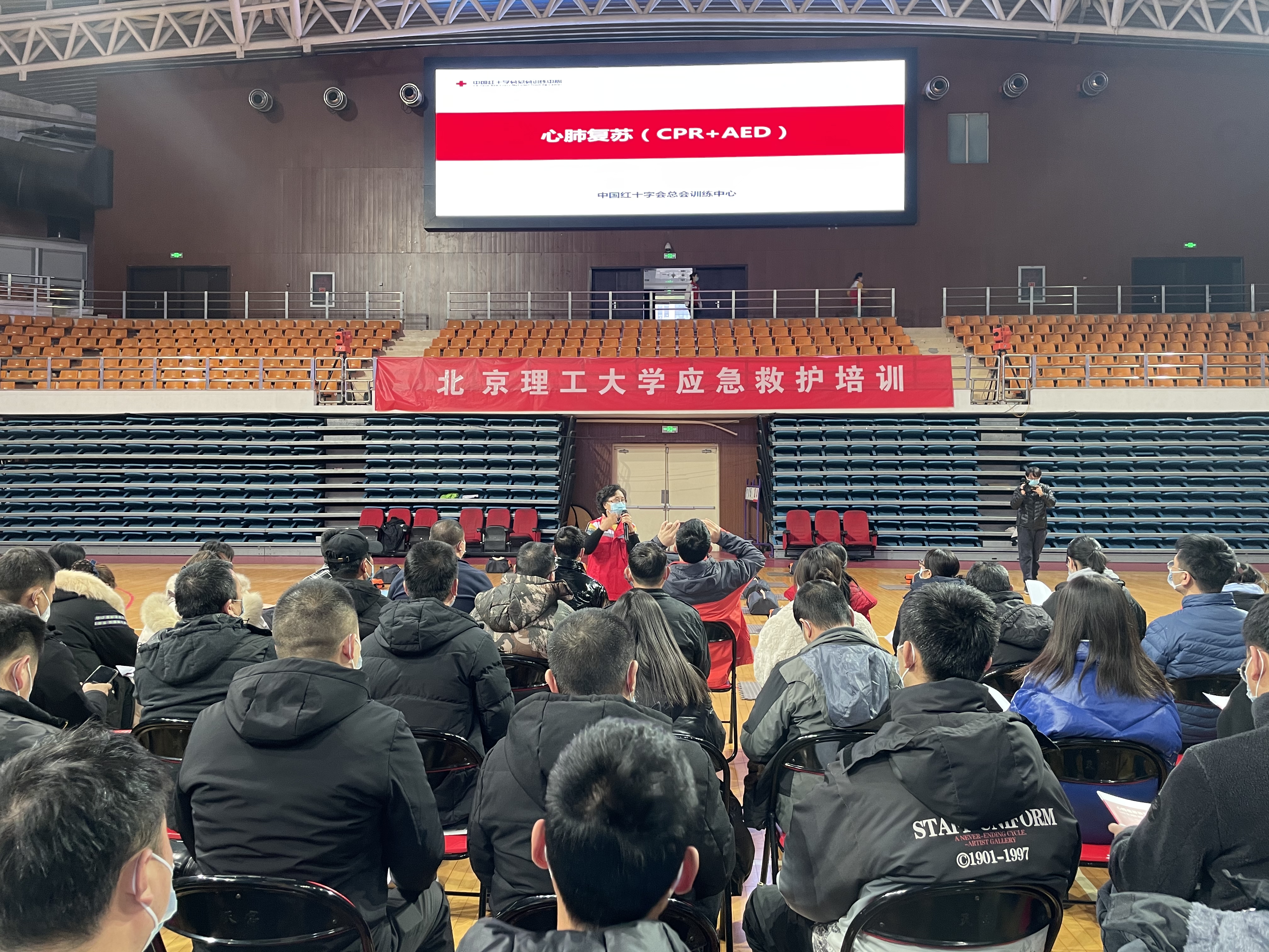 为提高师生急救知识,熟悉心肺复苏(CPR+AED)操作技能,具备为他人施救能力,betway西汉姆联联合后勤基建处于2021年12月23日下午13:30在体育馆篮球场组织学院师生参加北京市红十字会举办的心肺复苏(CPR+AED)应急救护培训。