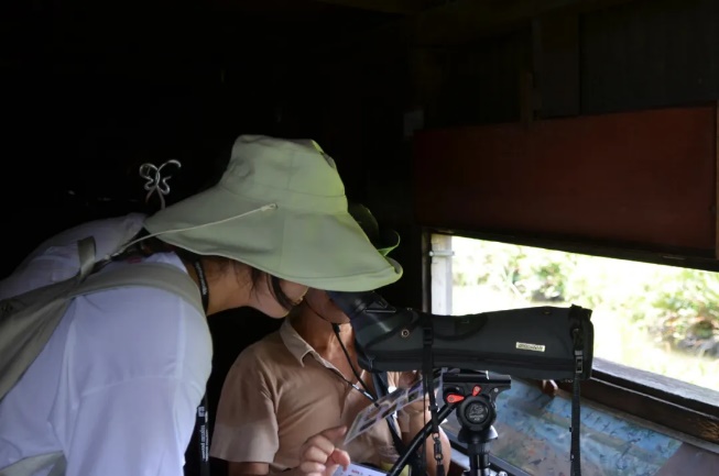 经过上述的廊道,我们来到了一处木屋——观鸟台。接着,我们登上了三层高的观鸟台,从窗户向外眺望,发现了许多鸟类,甚至有一些连导游也无法辨识的鸟种。
