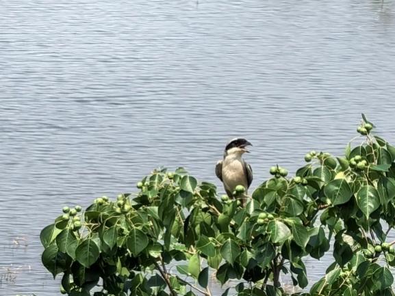 不一会儿飞来一只很像棕背伯劳的鸟,就停落在离我们很近的树上。导游仔细观察了一会,还是判断这应该不是棕背伯劳。