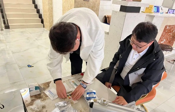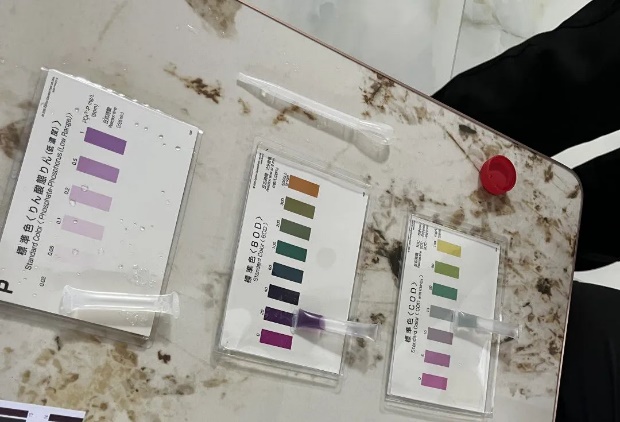 生态科考团的队员们对茶卡盐湖水质进行取样并进行检测分析。