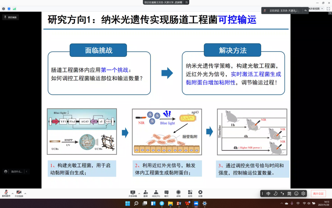 为加强学术交流,天津大学王汉杰教授应我院霍毅欣教授邀请,于11月20日下午为师生们带来了题为《光遗传工程菌生物活药研发》的线上报告。报告由马晓焉副研究员主持。