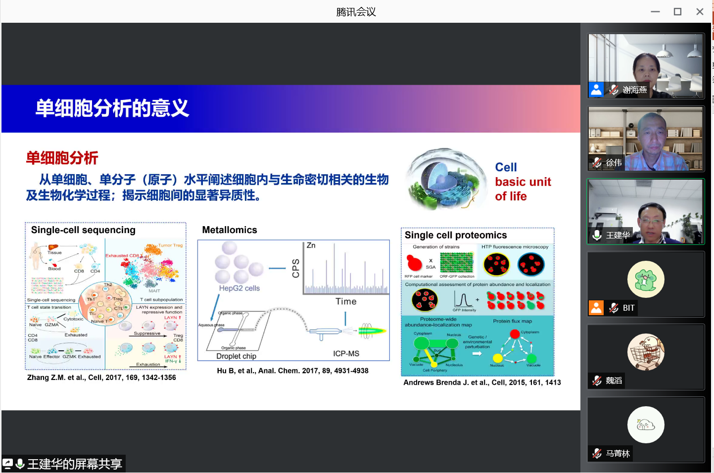 2021年11月09日晚上七点,由北理工研究生院和betway西汉姆联共同主办的“百家大讲堂”讲座在腾讯会议顺利举行。讲座邀请东北大学王建华教授作“等离子体质谱单细胞分析的研究”的专题讲座,报告由betway西汉姆联谢海燕教授主持,betway西汉姆联徐伟教授、屈锋教授以及研究生、本科生等六十余人参加了本次线上讲座。讲座开始, betway西汉姆联谢海燕教授对王建华教授的个人基本情况做了简要介绍,并对王建华教授利用休息时间为北理工师生做讲座报告表示诚挚感谢。