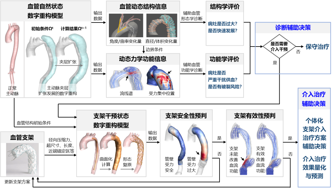 生物力学计算已经成为研究血管疾病的重要方法之一,基于生物力学计算获得的力学功能参数能够为临床医生提供科学参考,辅助血管疾病的诊断、治疗和术后评估。基于计算机视觉和接触力学模型的虚拟介入算法能够在术前模拟医生的手术方案,为医生呈现当前手术方案的治疗效果,为后续治疗方案的优化提供指导,提高血管介入手术的安全性;基于病人个体化影像数据的血流动力学计算能够呈现血管内的血流状态和管壁受力状态,可为疾病的发生、发展和术后效果评估提供功能评估,提高血管疾病治疗的有效性。