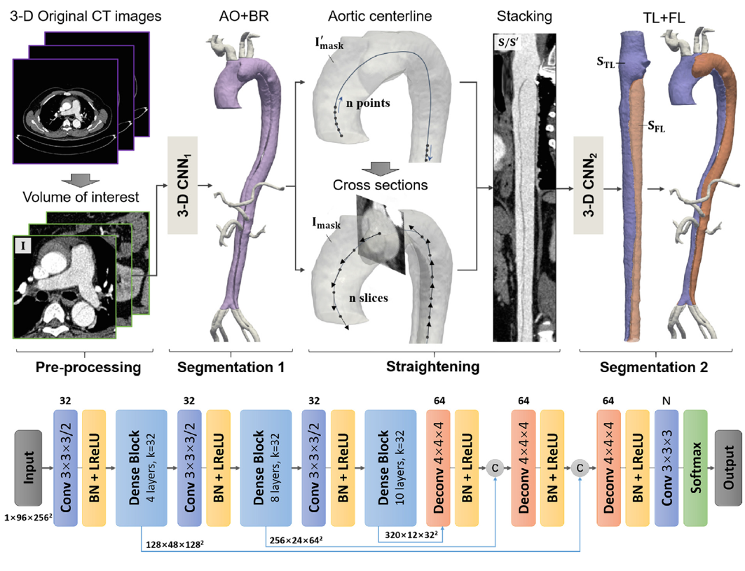 针对心血管疾病术前诊断不准确,手术规划不科学,术后效果评估不客观的问题,课题组实现了1) 基于深度学习研发应用于多种血管疾病的图像自动分割及三维重建算法,建立了以Denseblock为主结构的卷积神经网络架构,结合Inplace-abn算法优化反向传播过程,以提高算法执行效率,服务于心血管疾病的智能诊断和立体参数准确测算;2) 基于计算机视觉可变形网格算法和生物力学接触模型,构建具有时效性和准确性的虚拟手术算法,该算法计算时间约为15s,计算准确度优于93%,有效服务于临床介入手术术前规划;3) 基于计算流体力学方法和大量临床随访案例研究,获得血流及压强等功能参数与随访过程中血管形态转归的关系,为术后效果提供具有量化性和预测性的功能评价参数。基于材料力学测试方法,对夹层膜片组织进行了材料属性测定,确定了其本构方程相关参数和断裂强度,为介入手术安全性提供力学功能评价参数;4) 基于以上关键技术,搭建了血管介入手术智能规划系统,使其嵌入血管影像自动分割重建算法,虚拟支架仿真算法和有效力学功能评价参数。通过人机交互式操作,术者可进行术前演练并获得手术方案治疗效果评估结果,主要包括介入手术的安全性和血流功能改善程度的评估,从而为医生优化手术方案提供科学指导。基于上述智能诊断、术前规划和力学功能参数评估体系,集成一体化诊疗系统,服务于心血管疾病的科学治疗,提供自动化、精准化、功能化的智能诊断平台。