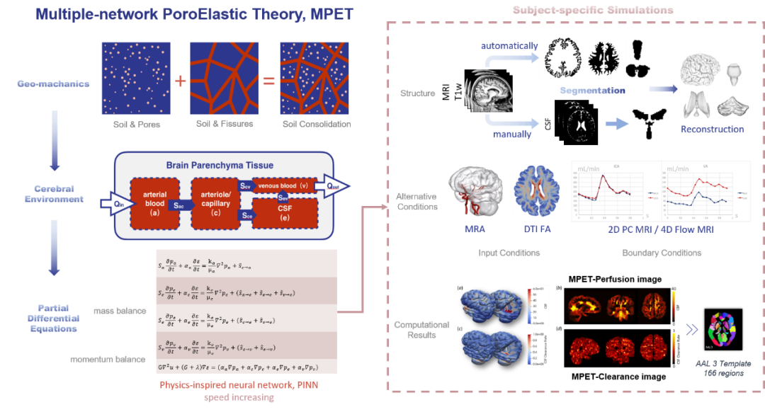 孔隙介质弹性理论最初用于描述土壤固结和油气田渗透现象,这些多相系统中的物质行为与器官血流灌注相似。由于器官中各种流体的力学性质不同,故分为多个流体网络。以模拟脑环境中的流体转运情况为例,仿真包含动脉血管网、毛细血管网、脑脊液网和静脉血管网四个流体网络。该仿真架构依赖多模态MRI建立计算域并添加丰富的参数输入接口。受试者T1w图像三维重建得到特异性器官结构模型;TOF-MRA可引入血管走形标记;DTI可得到渗透张量场;PC MRI可得到血流量入口条件。多网络孔隙介质弹性理论仿真架构充分利用现代计算机技术实现高效求解,克服了传统解析方法的局限性,可提供量化的灌注功能影像模态并辅助心脑等器官灌注异常研究和临床决策。