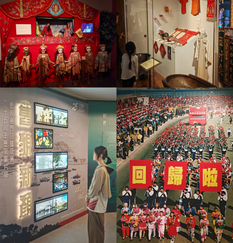 登上二楼,团员参观了澳门的民俗文化与回归历史展览,了解了澳门在文化交织碰撞中演化出的服饰、婚嫁等文化特色与商贸、手工业的发展历程。在澳门回归板块,团员学习了澳门回归的前后历程,通过展览中对回归场面的重现照片资料、澳门回归前后各界的祝贺与对解放军进驻澳门的报道与澳门葡占时期与回归后的发展对比,体会到了澳门人民深厚的家国情怀。