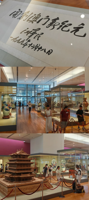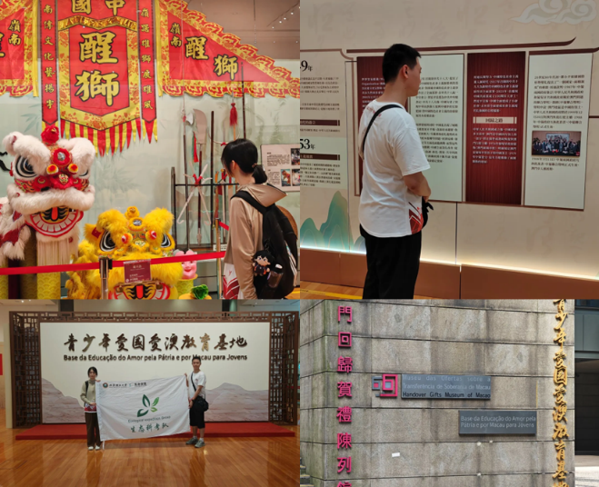 下午,澳门团来到澳门回归贺礼陈列馆暨青少年爱国爱澳教育基地。青少年爱国爱澳教育基地的展览首先以关于中国近现代历史更改的完整介绍开始,还可以看见来参观的居民向自己儿女讲述历史;而后是对岭南文化的科普,讲述了粤语、闽南语客家方言与岭南的戏曲、建筑、民间艺术等文化,团员在参观中又补充学习到了中华大地南方的特色文化。
