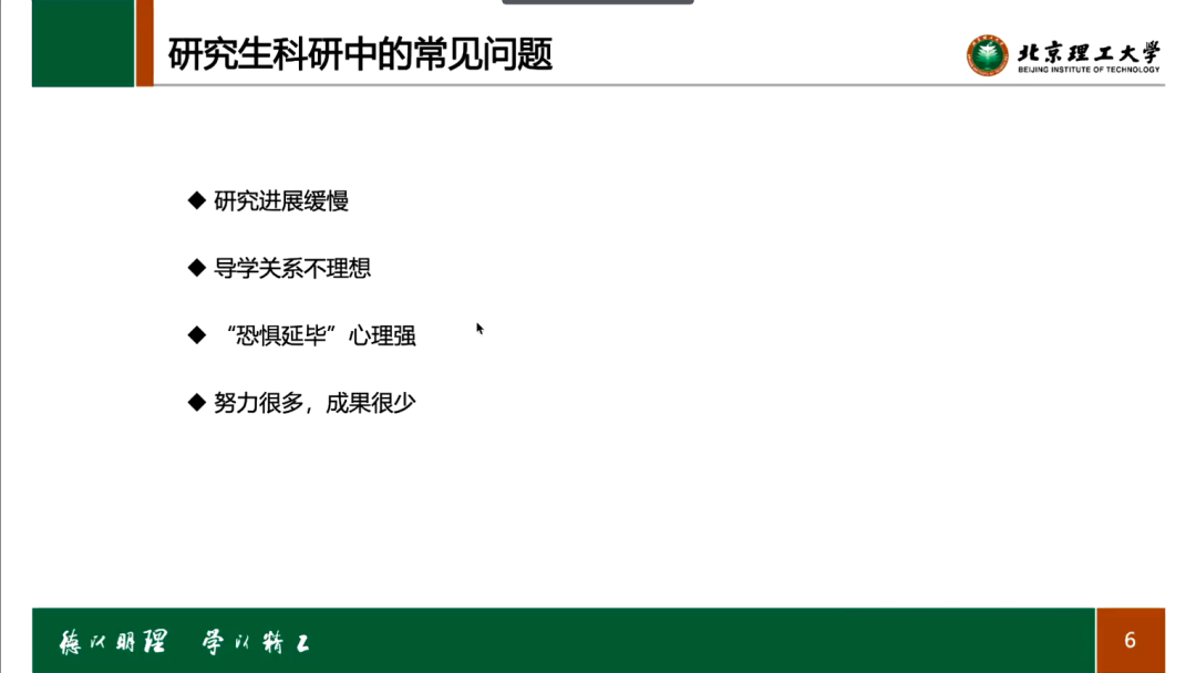 由于参会的同学大多为研究生,苏老师便以大家常常关心的科研来引入话题。首先,苏老师总结了大家在科研过程中所遇到的常见问题,陌生而又熟悉的案例使得大家深有感触,这也使得后续老师在讲述缓解内心焦虑的方式时,大家能够更好地认可并接纳。例如,对于老师讲述的“生活学术化,学术生活化”的理念同学们反响热烈,比起一两年的“突击”科研,显然不如在平时生活中将科研作为一种习惯,不停地熏陶培养自己的学术素养和习惯。