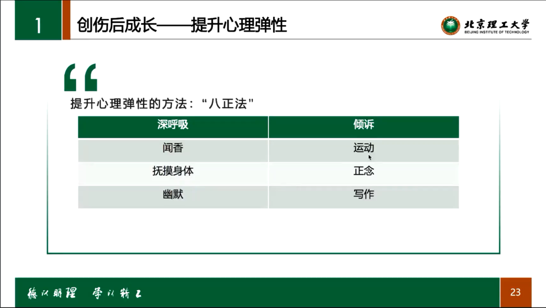 随后进入正题,面对重大公共卫生事件之下的时代背景,同学们在所处的而这种环境下有何成长机遇?苏老师先介绍了创伤性事件的概念与特点,然后在经历这种事件之后的创伤后成长,如心理的幸福感优势等等。“经历过苦难的人,会更难被痛苦所影响,无论是生理上还是心理上。”接着苏老师便分析这种现象产生的原因,在困境中个人内心的力量才得以体现,也能够激发出更多的个人力量。再到创伤后如何成长,要用主动反刍代替侵入性反刍,以客观的角度进行自我评估。最后,苏老师讲述了提升自我心理弹性以及自我调控力的方式。