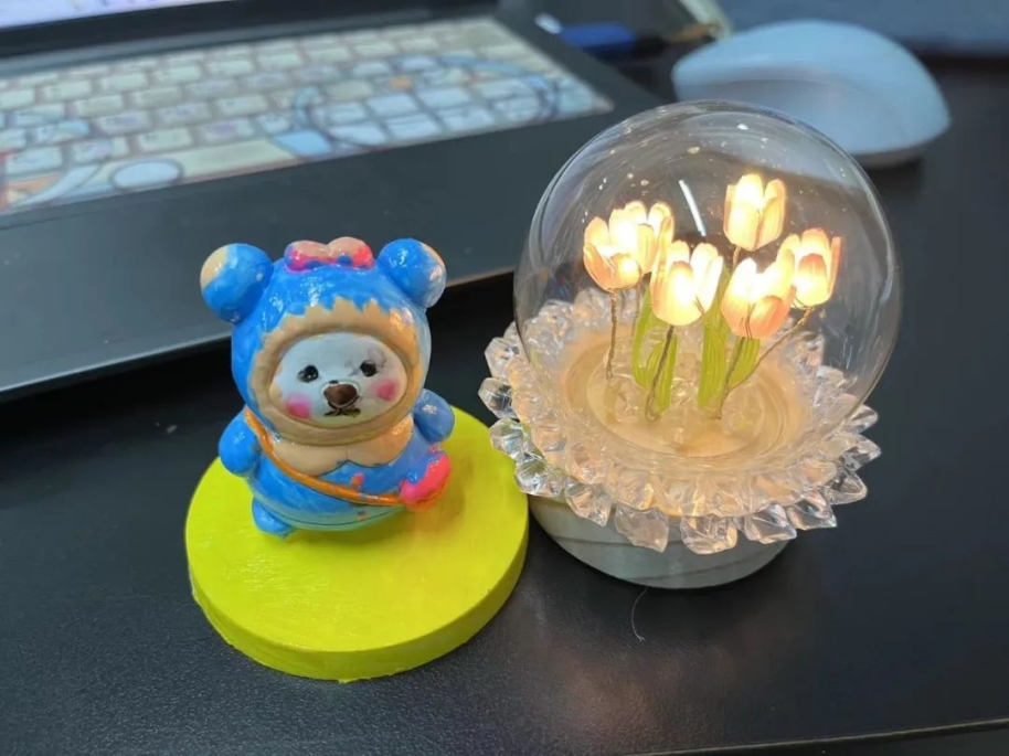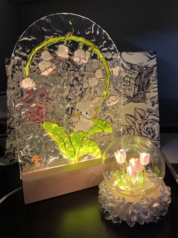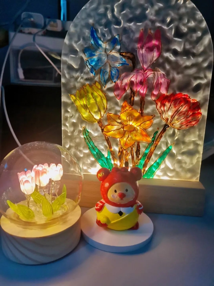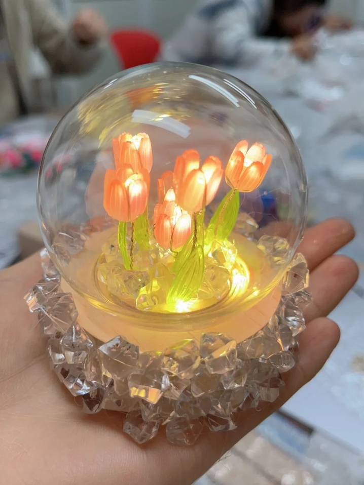 这位同学在做水晶球郁金香小夜灯,小夜灯不仅能为房间增添温暖氛围,还可以展现大家的个人风格。大家可以选择透明的玻璃瓶或塑料容器作为灯罩,并在其中放入LED灯珠或小彩灯。通过添加亮片、贝壳或丝带等装饰物,您可以让小夜灯更加独特。制作方法简单,只需将LED灯珠固定在瓶内,再将容器放置在合适的底座上即可。