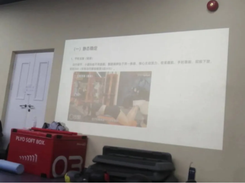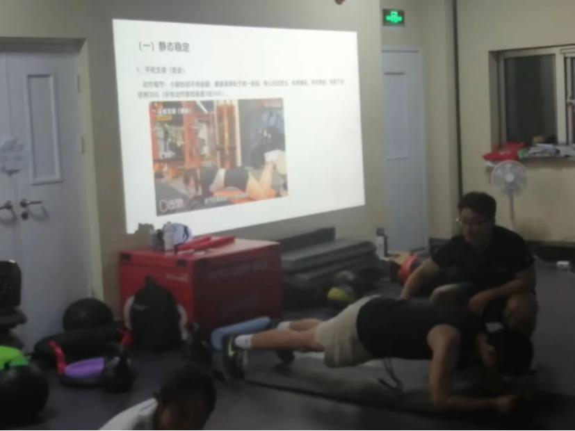 第二部分,张教练开始讲解核心训练,并让大家开始训练,首先是平板支撑,张教练找来邵光亮同学作为模特,教大家动作细节