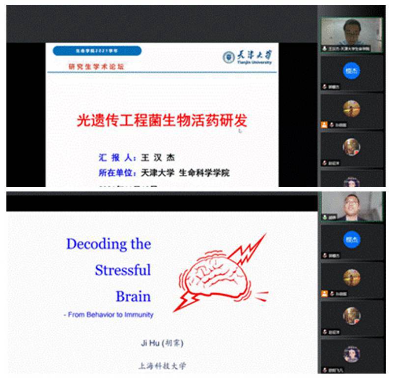 天津大学生命科学学院王汉杰教授的《纳米光遗传工程菌》报告中介绍了光遗传学技术以及“纳米光遗传学”的调控策略,从多个研究方向入手,介绍了纳米光遗传的多方面应用。上海科技大学胡霁研究员作了题为《应激:从行为到免疫》的报告,详细报告了应激行为与人类免疫的密切联系,对同学们的学术科研有很大的启发作用。