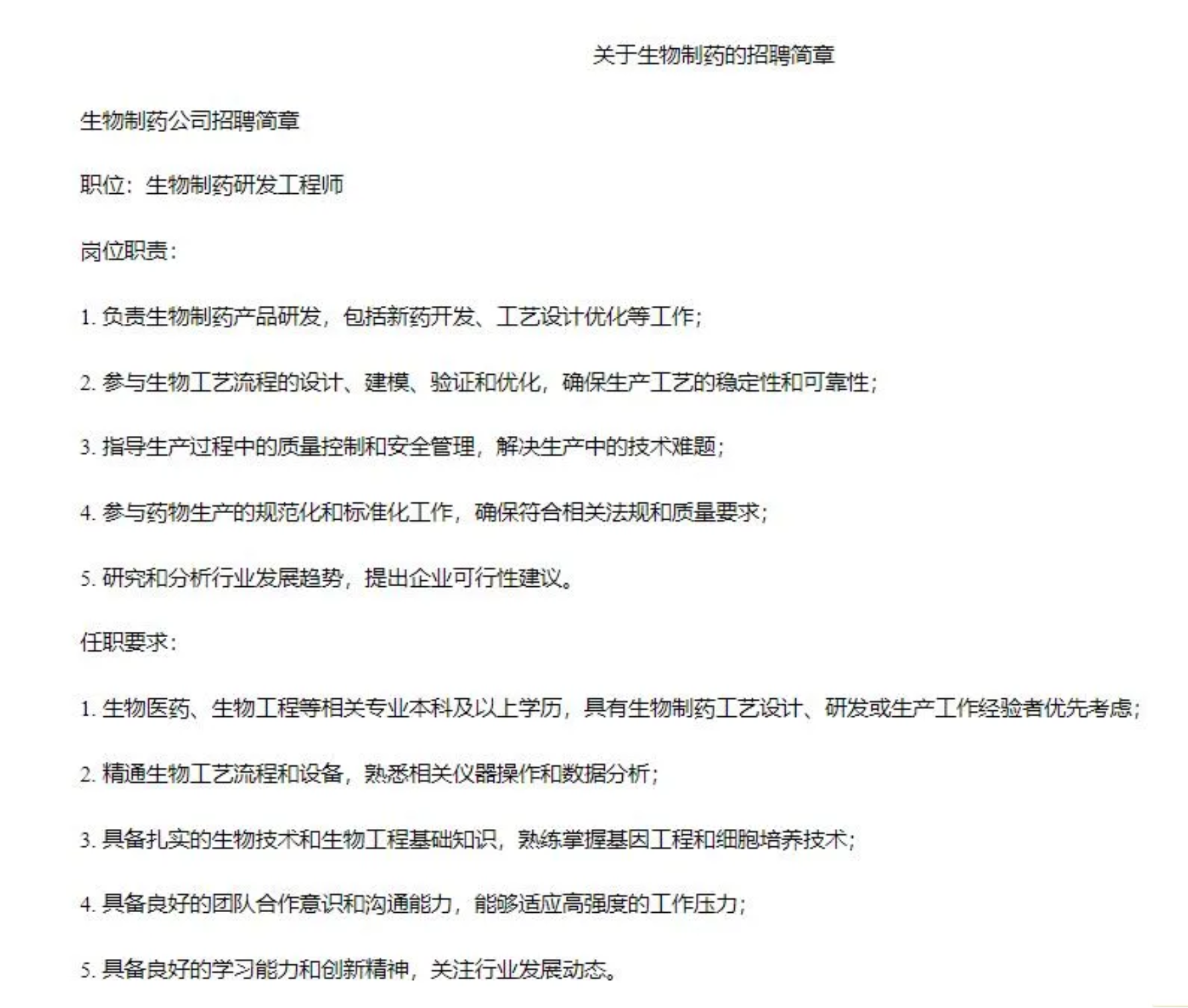 关于生物制药的招聘简章