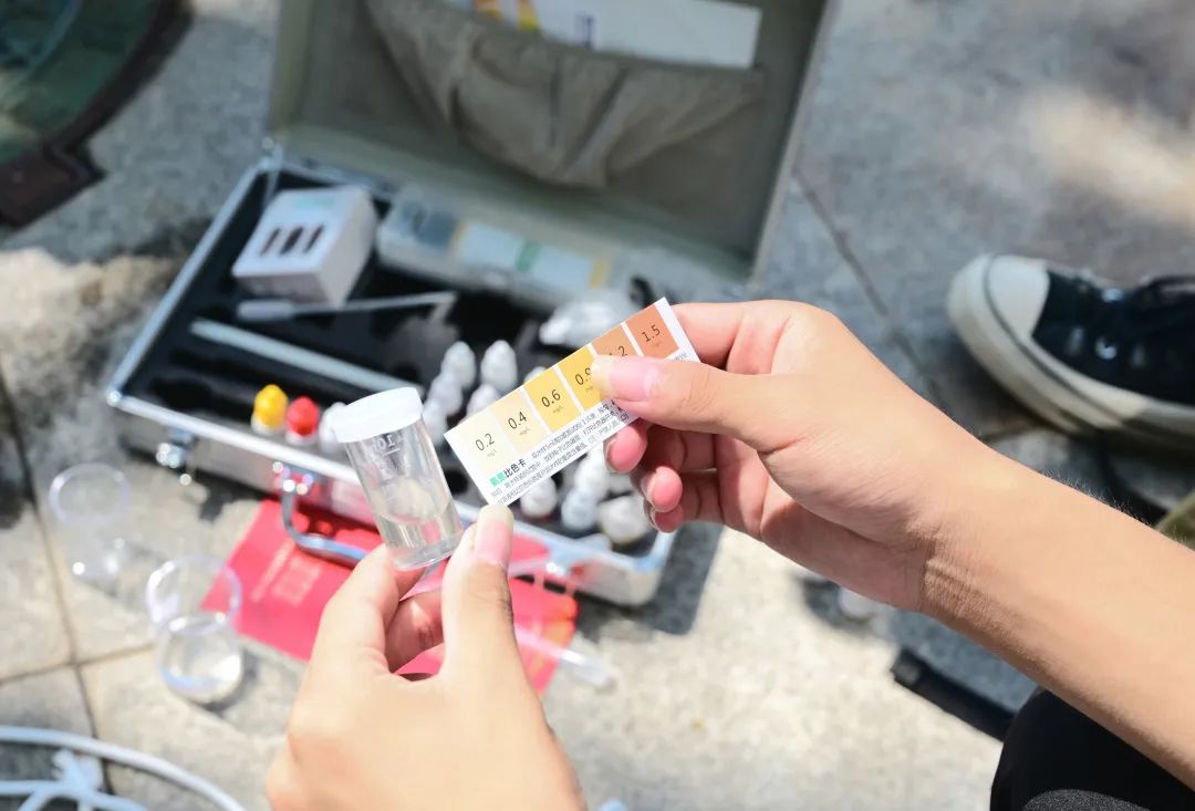 实践第二天,生态科考团来到汉江所流经的集家嘴码头和舵落口江滩公园进行水质采样并检测,两地分别位于汉江在武汉段的上游和下游,科考团成员将两地采集水样检测结果进行比对,既能在表观层面上得到汉江水质的情况和变化,也能在一定程度上得到城市对汉江水质的影响,引导人们减少对汉江水质的破坏。因此,生态科考成员也集思广益,讨论了多种有助于城市水文生态文明建设的建议和方案。