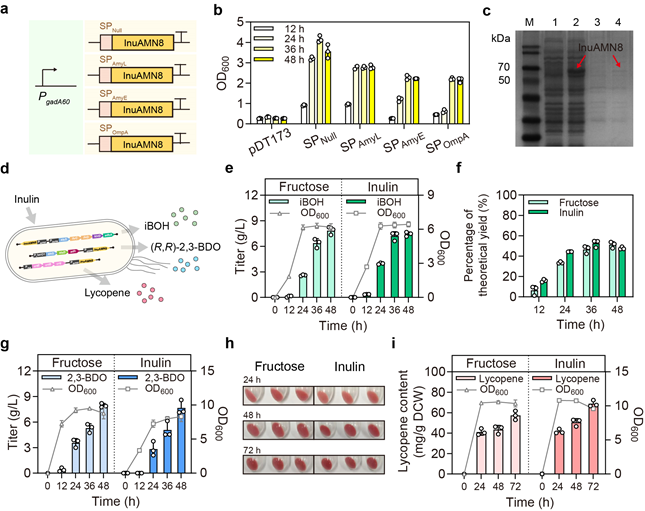 对微生物基因组的改造可以调整菌株的代谢网络,减少竞争代谢途径的影响,使菌株更高效地合成目标产物。因此,通过分析济州杆菌的代谢网络,并利用CRISPR/Cas9基因编辑系统,对L23菌株基因组进行了快速且高效的改造,以获得工程改造菌株L23R7。进一步通过分泌表达外切菊粉酶InuAMN8,实现了L23R7菌株以菊粉为底物分别生产7.4 ± 0.2 g/L异丁醇、7.7 ± 0.8 g/L ( R , R )-2,3-丁二醇或68.8 ± 3.1 mg番茄红素/g DCW。证明了济州杆菌作为NGIB新平台宿主,以非粮生物质菊粉为底物,非灭菌发酵生产多种高附加值化合物的潜力(图3)。
