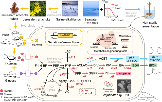 传统工业生物技术依赖于农业原材料和高温灭菌的生物过程来生产大宗化学品。该技术仍存在一些亟需解决的问题,例如,原材料成本价格高、灭菌过程繁琐且能耗大、微生物污染频繁、产品转化效率低下、发酵设备昂贵、大量消耗淡水等。下一代工业生物技术可以基于极端微生物,比如嗜盐菌,在开放的非灭菌环境下发酵生产,并使用可再生资源的原料来进行低成本的绿色生物制造。因此,霍毅欣团队首次开发了一种类似大肠杆菌的易于工程改造的新型耐盐微生物平台,济州杆菌 Jejubacter sp. L23。并通过生物合成途径和宿主代谢途径等多方面工程改造,成功实现了以济州杆菌为宿主,利用非粮生物质菊粉为底物,进行非灭菌发酵生产多种大宗化学品,如异丁醇、( R , R )-2,3-丁二醇和番茄红素(图1)。
