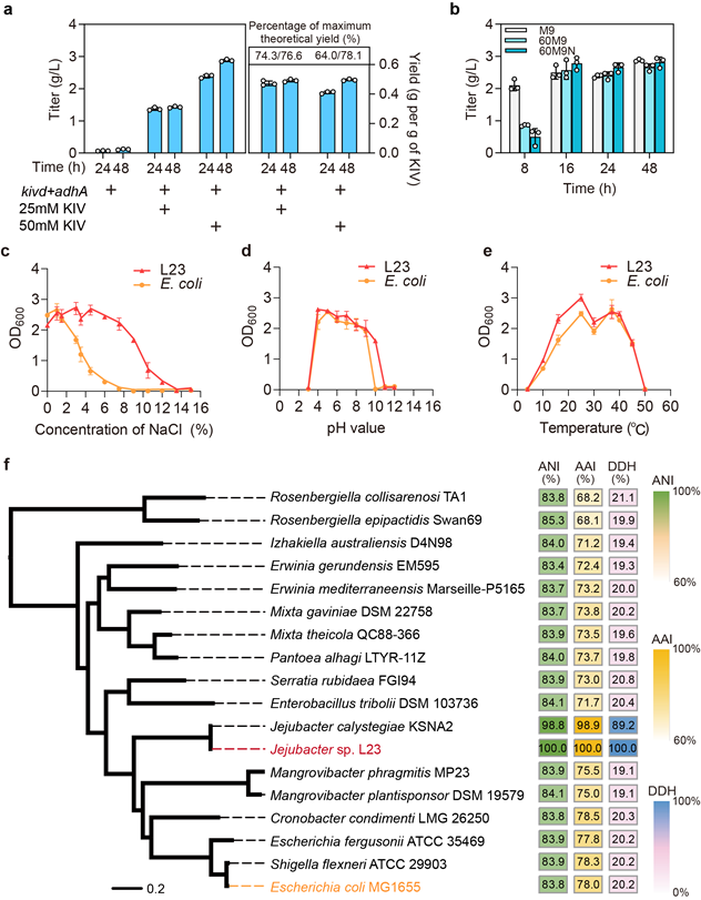 本研究从超级蠕虫 Zophobas atratus 肠道中分离出一株耐盐肠道微生物,并鉴定该菌株为济州杆菌 Jejubacter sp. L23。L23菌株为革兰氏阴性菌,细胞呈杆状,兼性厌氧,能够在0~12%(w/v)NaCl,10~45℃,以及pH 4.0~10.0的条件下生长。并且与大肠杆菌具有高度的生理生化及遗传相似性。通过对该菌株进行系统研究,开发了一系列代谢工程改造相关的基因元件、遗传操作方法和基因编辑工具等。以α-酮异戊酸为底物,L23菌株在低盐灭菌、高盐灭菌以及非灭菌的条件下均可高效生产异丁醇。初步证明了济州杆菌非灭菌发酵生产异丁醇的可能性(图2)。