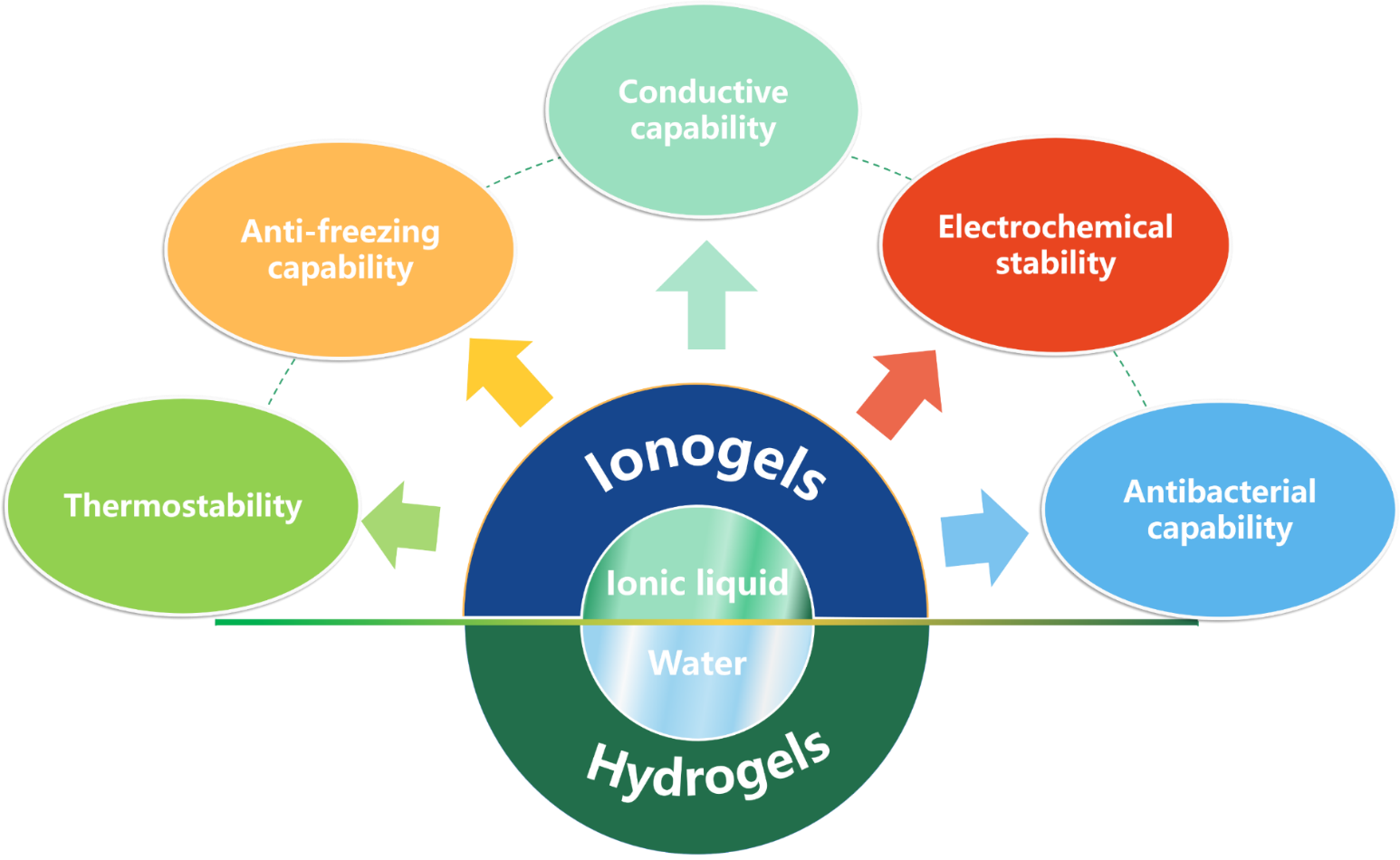 示意图1. 离子凝胶相比于水凝胶的特殊性能
