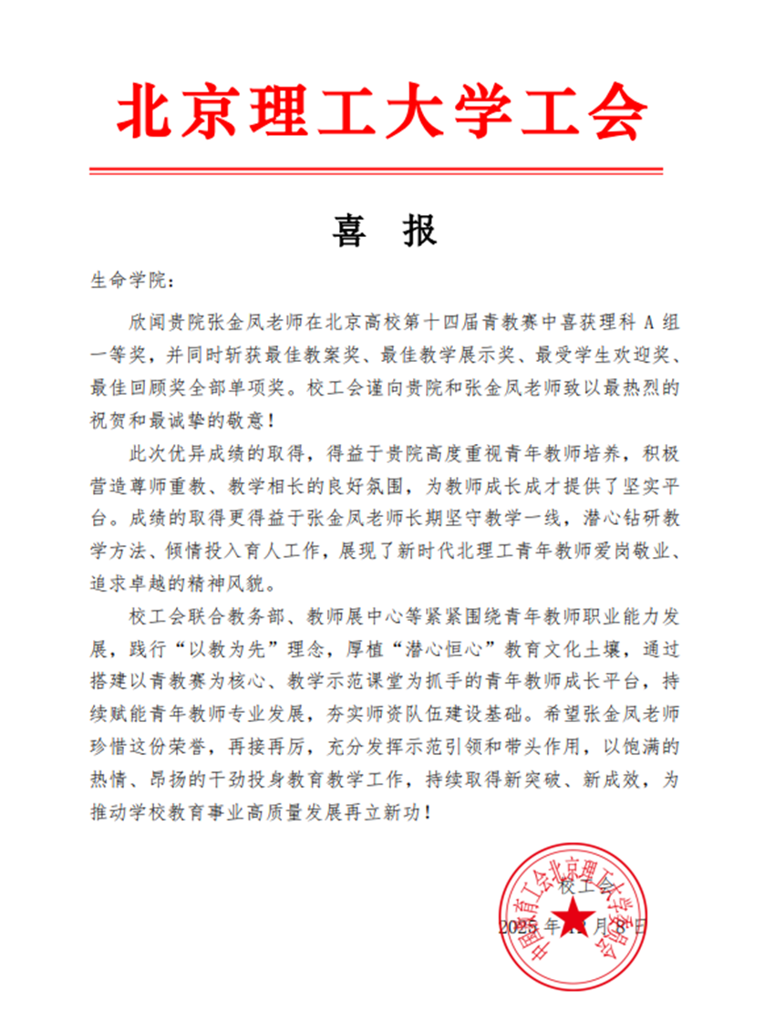 12月6日,北京高校第十四届青年教师教学基本功比赛结果正式揭晓,betway西汉姆联青年教师张金凤荣获理科类比赛一等奖,同时历史性获得最佳教案奖、最佳教学演示奖、最受学生欢迎奖、最佳教学回顾奖全部四个单项奖,学院王睿、安宜荣获优秀指导教师奖。