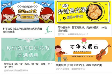 2019年,她成为学院学生会副主席兼任新闻部部长,策划并组织学院新年晚会、年度表彰大会。2020年初的一场疫情席卷全国,在足不出户的日子里,她积极发挥新媒体作用,充分利用学院微信公众号平台,配合学院办公室设计策划了一系列线上活动。《宅家征集令》向同学们提供了“劳艺展示”平台;《21天运动打卡》让同学们居家也能坚持锻炼;《疫情防控知识竞赛》更是传播科学理念,做到“科学防疫”;《众志成城,共克时艰》集结生命学子为武汉加油,在丰富师生居家生活的同时,传递防疫知识,阐述科学原理,充分发挥“领航”职责,让同学们“同心抗疫,共克时艰”。