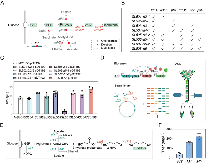 我们使用这些sgRNA突变体开发了基于CRISPR/Cas9的多靶点基因编辑工具箱,可以同时实现至多4个位点的基因敲除以及碱基突变。利用该基因编辑工具箱,我们实现了底盘细胞快速工程化改造,得到一系列敲除了不同副途径的异丁醇生产菌株,并实现异丁醇高产菌株的构建成功将化学品异丁醇的摇瓶产量提高到了13.9g/L。为了拓展该系统的应用范围,我们利用该工具箱构建菌株突变库,并与本团队所报道的生物传感器BmoR相结合,筛选得到1,3-PDO高产菌株(图4),并且与野生型相比突变菌株的产量提高了4.5倍。