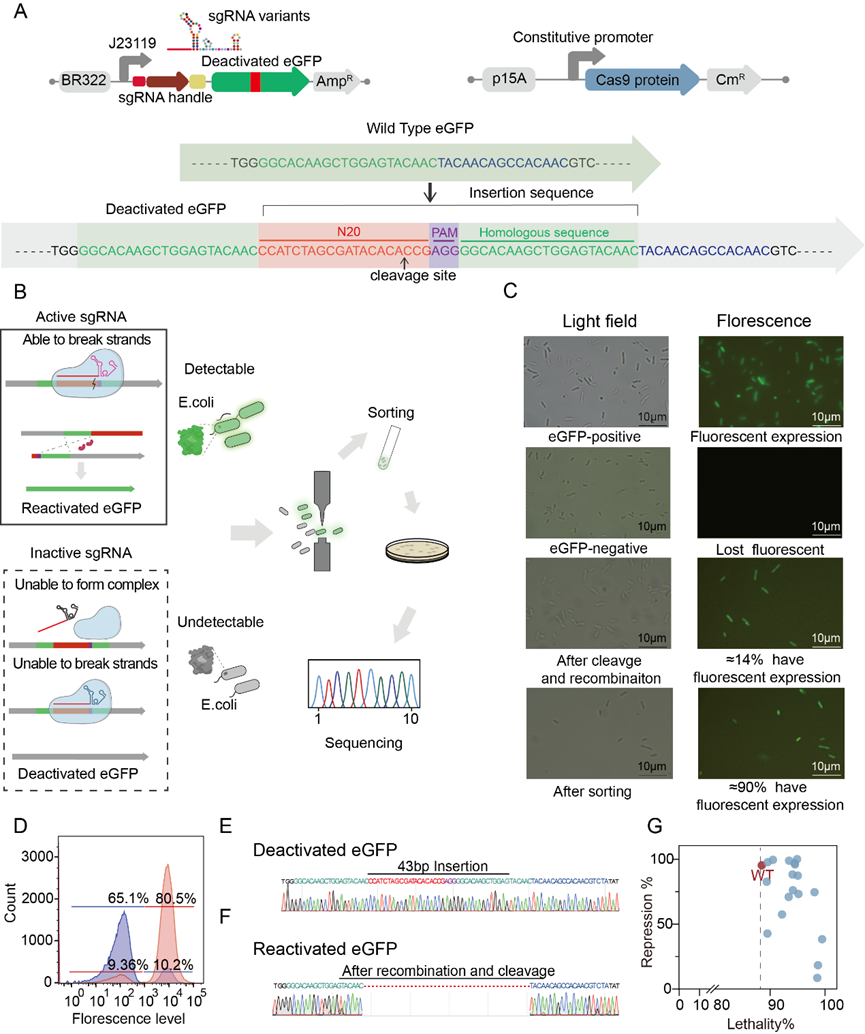 本团队长期从事CRISPR系统机制探究以及高效基因编辑方法学开发,2019年以“CRISPR-Cas9-assisted native end-joining editing offers a simple strategy for efficient genetic engineering in Escherichia coli”为题,在领域顶级期刊《Applied Microbiology and Biotechnology》上发表。该工作报道了一种基于原核体内的微同源末端重组系统的CRISPR/Cas9基因编辑方法,是一种最简单的基因编辑方法。我们利用该研究的DNA修复方法设计了一种基于生长和/或荧光激活细胞分选(FACS)的高通量sgRNA突变体正向筛选系统。我们首先在筛选标签中插入一段可以被识别的DNA靶点序列,并引入一段同源序列。当sgRNA突变体与Cas9蛋白形成二元复合体,并在有活性的sgRNA突变体引导下结合至DNA靶点序列形成三元复合体,激活Cas9蛋白核酸酶活性后,在所设计的DNA靶点将会出现双链断裂,激活原核细胞内的同源修复系统。该同源修复系统利用我们所引入的同源序列进行筛选标签的修复,使得细胞在筛选条件下出现可被筛选的表型,如可在抗性平板上生长或是通过流式细胞仪进行分选 (图2)。