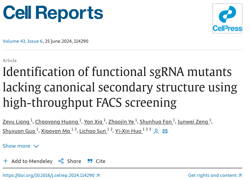近日,北京理工大学霍毅欣教授团队在CRISPR/Cas9系统功能性sgRNA突变体筛选方面取得重要进展。相关研究成果以“Identification of functional sgRNA mutants lacking canonical secondary structure using high-throughput FACS screening”为题发表在Cell 子刊《Cell Reports》上(https://doi.org/10.1016/j.celrep.2024.114290)。该工作以北京理工大学为第一通讯单位,博士生梁泽宇为第一作者,霍毅欣教授为通讯作者。