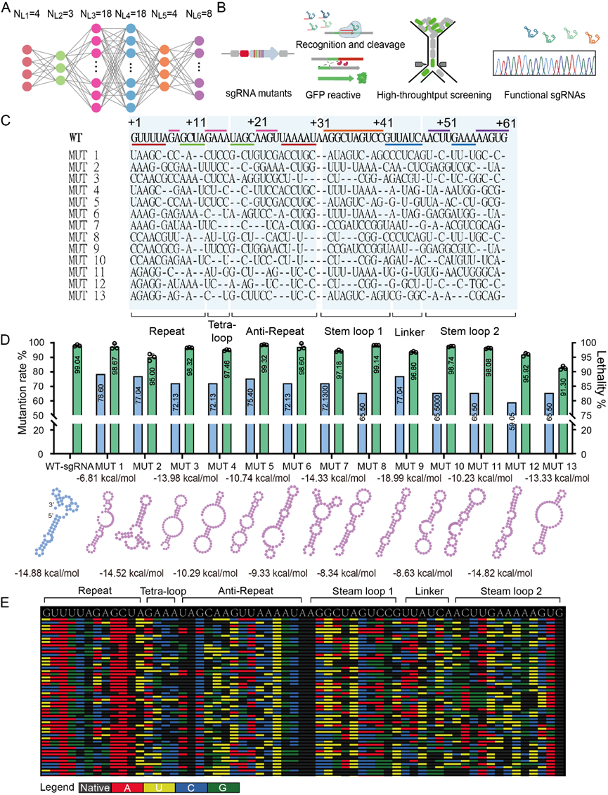 之后我们根据sgRNA的结构,分区进行突变库构建与筛选,将筛选得到的6个单区有活性的突变序列进行随机组合。利用该筛选系统,我们得到了具有突变率超过50%的sgRNA突变体序列,并且这些sgRNA突变体与Cas9蛋白形成复合体后仍能够在细胞内保持与野生型水平相当的核酸酶活性。通过结构模拟,我们发现这些sgRNA突变体由于具有高的序列突变率而失去了公认的典型二级结构,这表明Cas9蛋白与sgRNA突变体可以相互适应并进行结构校正。进一步,我们将高通量筛选系统与高通量测序技术相结合。通过高通量测序,最终得到了大量sgRNA突变体序列,并且这些突变体序列均与野生型sgRNA序列有巨大差异 (图三)。