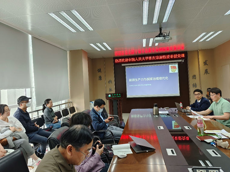 本次党课,张友浪同志围绕新质生产力的概念起源、内涵以及新质生产力和国家治理之间如何相互影响以及科研人员如何促进新质生产力等四个方面内容,紧密结合多年工作经历和生活趣事,用通俗易懂且幽默诙谐的语言讲述了新质生产力与国家治理现代化。在提到科研人员如何促进新质生产力时,他从基础研究到应用研究、跨学科合作、技术创新与专利开发、人才培养与知识传播、国际交流与合作、社会服务与政策建议等六个方面给出了专业解答。他强调科研人员将基础研究成果转化为应⽤研究,解决实际问题,直接推动新技术、新产品的开发是直接参与新质⽣产⼒提升的重要⽅式。