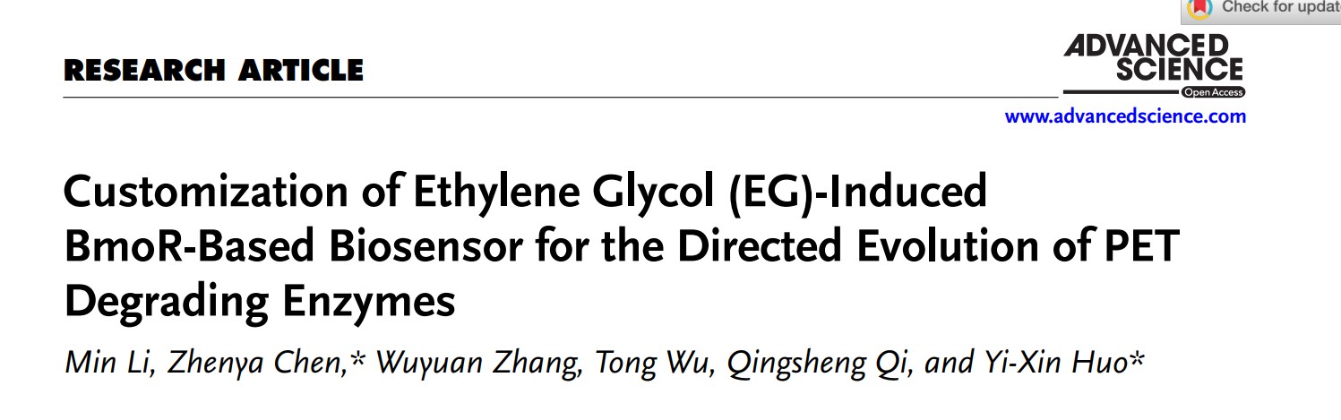 近日,北理工霍毅欣课题组在1区TOP期刊《Advanced Science》发表了题为“Customization of Ethylene Glycol (EG)-Induced BmoR-Based Biosensor for the Directed Evolution of PET Degrading Enzymes”的研究文章。文章为PET降解酶的定向进化提供了基于BmoR生物传感器可视化高通量筛选工具,加快了酶元件“设计-构建-测试-学习”循环,对塑料废弃物的生物降解及回收利用具有重要意义。该工作以北京理工大学为第一通讯单位,硕士生李敏和陈振娅研究员为共同第一作者,陈振娅研究员和霍毅欣教授为共同通讯作者,山东大学祁庆生教授为共同作者。